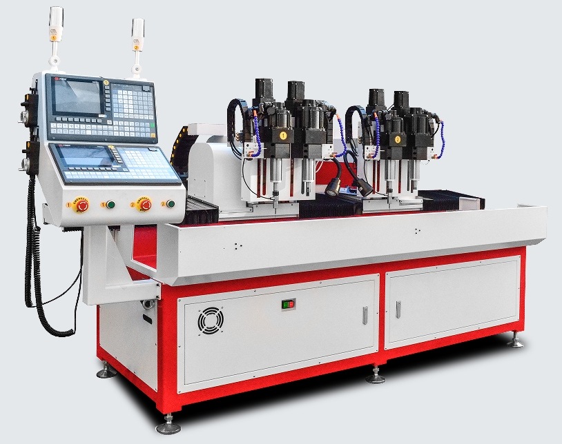 這是一臺(tái)來(lái)自浙江客戶定制的智能數(shù)控雙軸倒角機(jī),雙工位同時(shí)檢測(cè)并補(bǔ)償平面度后再進(jìn)行倒角加工。